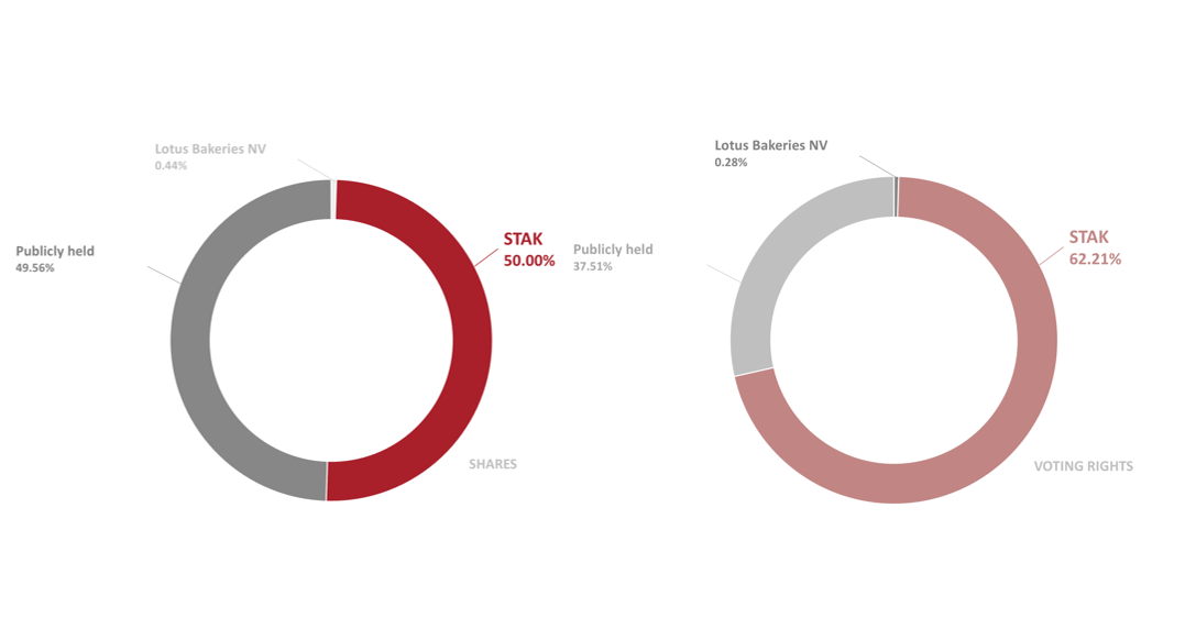 - Shares: there are 816,013 shares of Lotus Bakeries, in registered or dematerialised form, of which 3,589 treasury shares or 0.44%