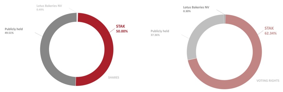 - Shares: there are 816,013 shares of Lotus Bakeries, in registered or dematerialised form, of which 3,960 treasury shares or 0.49%